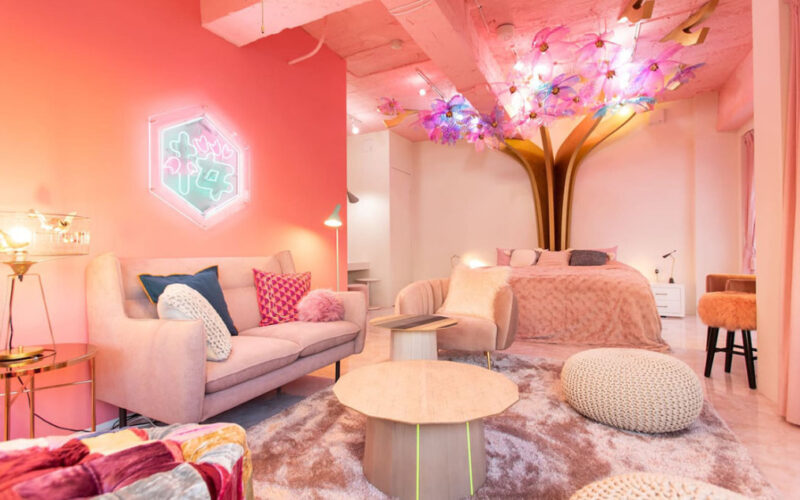 Nata per dare la sensazione di dormire sotto un ciliegio in fiore per tutto l’anno: al centro dell’appartamento troviamo un albero illumintato, che parte dal letto e illumina tutta la camera da letto con luci al neon di colore viola e rosa, proprio come le città del Giappone durante la fioritura dei sakura. Alla camera da letto, che può ospitare fino a sei persone, si aggiunge una cucina totally pink, ma in una tonalità più tenue rispetto alle altre stanze. Completano il tutto un piccolo bagno, un’area make up ed un piccolo balcone di colore giallo limone, sul quale gli ospiti potranno non solo godere della vista della bellissima città di Tokyo.